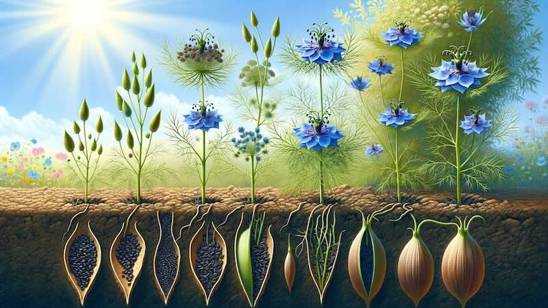 W miarę wzrostu, czarnuszka wypuszcza piękne, niebieskie kwiaty, które są nie tylko ozdobą ogrodu, ale i przyszłym domem dla nasion. Po kwitnieniu, kwiaty ustępują miejsca strąkom, w których kryją się nasiona. Gdy strąki wyschną, to znak, że czas na zbieranie nasion – małych, ale potężnych bohaterów naszej opowieści.